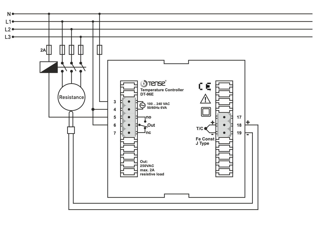 Thermostat / 2-point temperature controller for panel mounting ON/OFF ON/OFF control mode, measuring range 0°C … +600°C, resolution / step 1ºC (made in Turkey, TENSE)