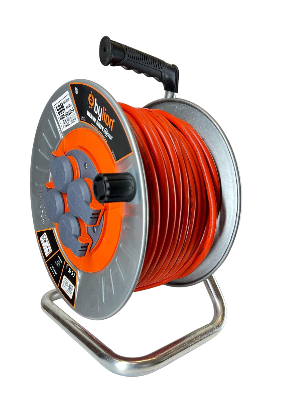 Kovový naviják ByLion MMP-50325-F – 50 m, 3×2,5 mm², kovová, 4 zásuvky, IP44